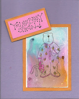 The Inky Antics bear is stamped on a background I made by inking up a perspex block with Distress inks in 3 different colours (to tell the truth I can't remember which as it was done about a month ago and has been sitting waiting to be used since then though I am pretty sure 'Picked Raspberry' was one of them). Then you spritz the block to let the colours run being careful not to let it get to murky before stamping it on your card stock. With my water brush I added a little yellow Distress ink to the bees on the bears jammies! Picked Raspberry was added to his collar and cuffs and to the bunny's jammies also. A dob of glitter glue on his buttons and the bunny's nose. The layers were cut with MFT dies from the 'Stitched Rectangle STAX'. The saying is by Stamps By Judith and Heather.
