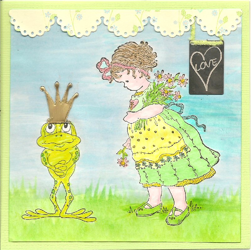 I masked and stamped the Penny Black image 'Pickin' Posies' (which is a rather old stamp) and coloured it using Tombow markers. The frog is by 'Sparkle N Sprinkle' and also coloured with Tombow markers. The background is a water wash of Distress ink 'Tumbled Glass' and 'Stormy Sky'. For the grass I used an All Night Media (think this company has folded) stencil/template 'Summer Fun' and dye ink 'Chartreuse' by Impress. I cut a scalloped edge out of Patterned paper with an MFT die from Blueprints #6. The crown on the frog was clear acetate I coloured the back with Gold Krylon pen. The 'love' metal charm I bought in Europe 15 years ago...maker unknown. A touch of Gold Glitter Wink of Stella brush on the girl's dress and Clear Glitter Wink of Stella on her hair ribbon.